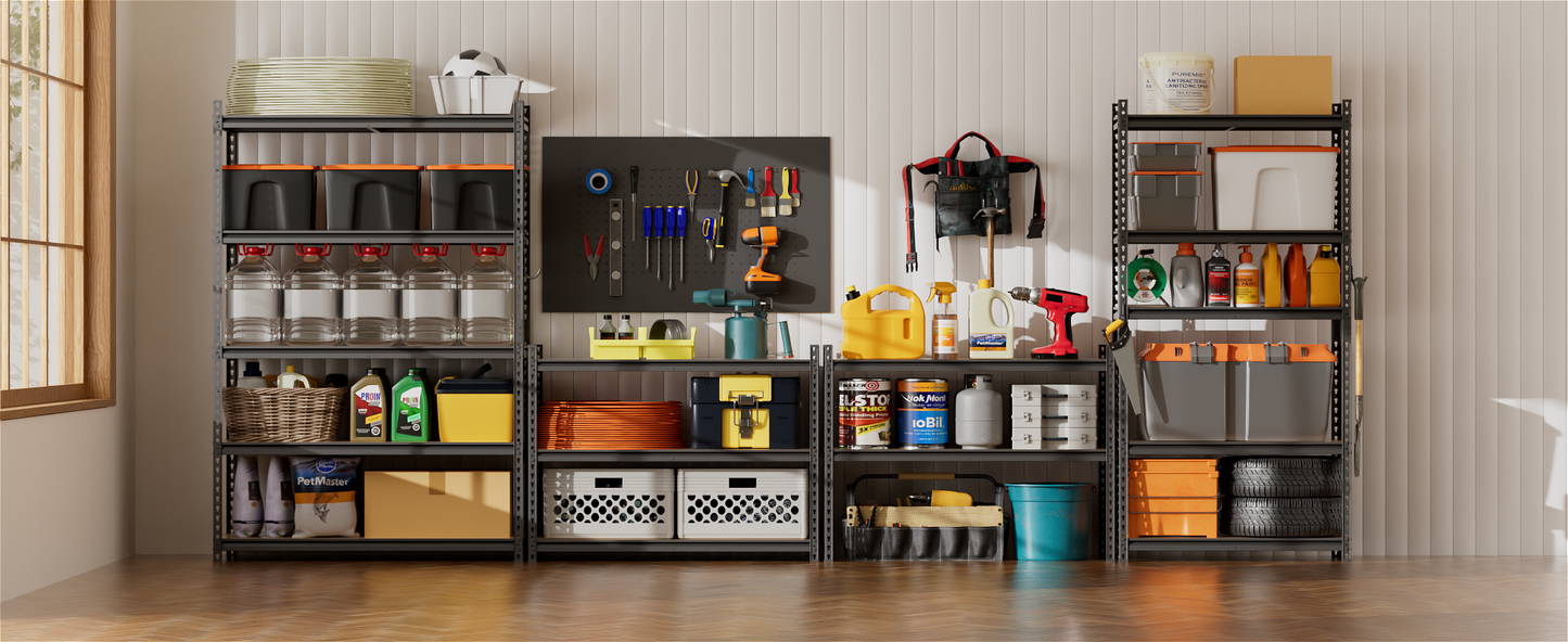 【CUSTOMIZE YOUR SPACE】 Fully adjustable shelves adapt to your needs. Set the height for large bins or small boxes. Assemble as a 72" tall 5-tier rack or as two 36" workbenches. This versatile storage rack is the perfect garage organizer or workshop workbench.