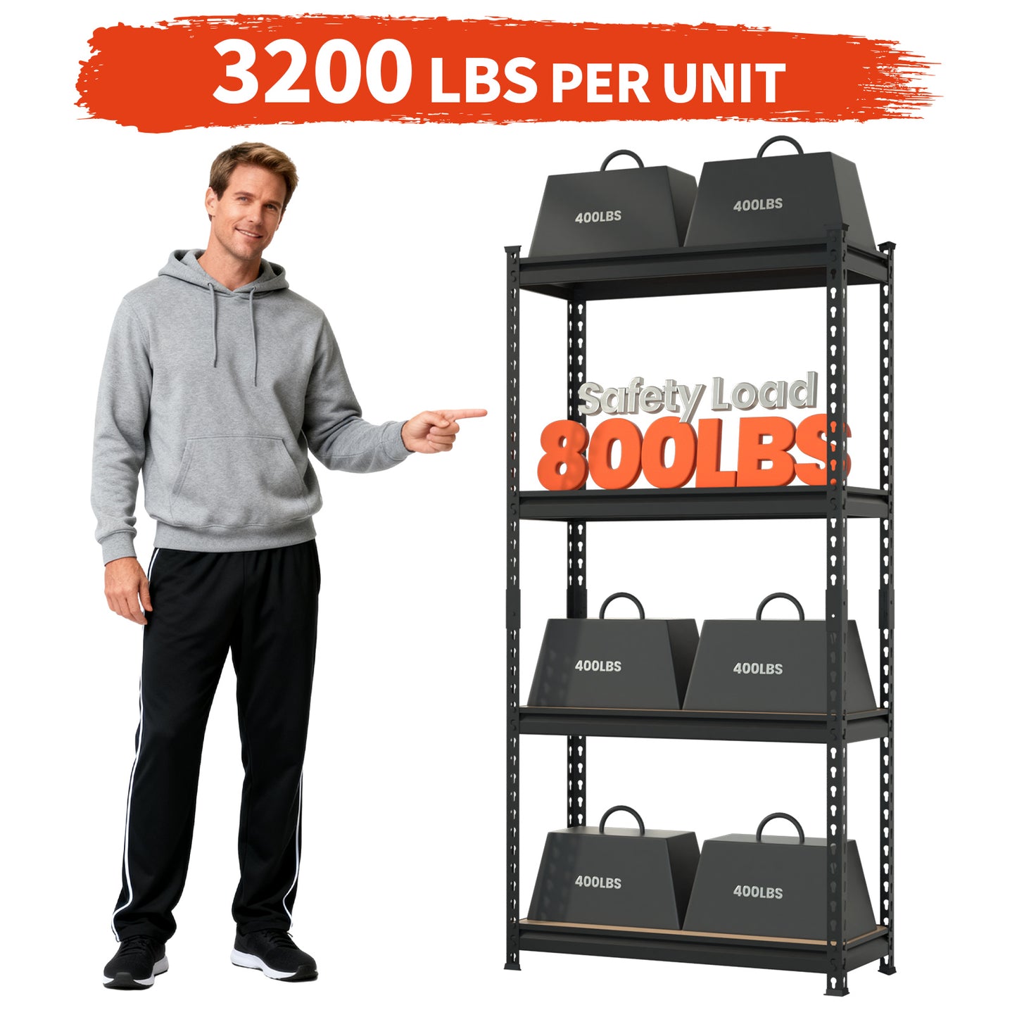 【INDUSTRIAL STRENGTH, 3200 LBS CAPACITY】: End garage clutter with this heavy-duty garage shelving unit. Engineered from reinforced steel, this industrial metal storage rack supports a massive 3200 lbs total (800 lbs per shelf). This freestanding shelving unit is perfect for heavy tools, tires, and equipment, providing a stable and secure storage solution.