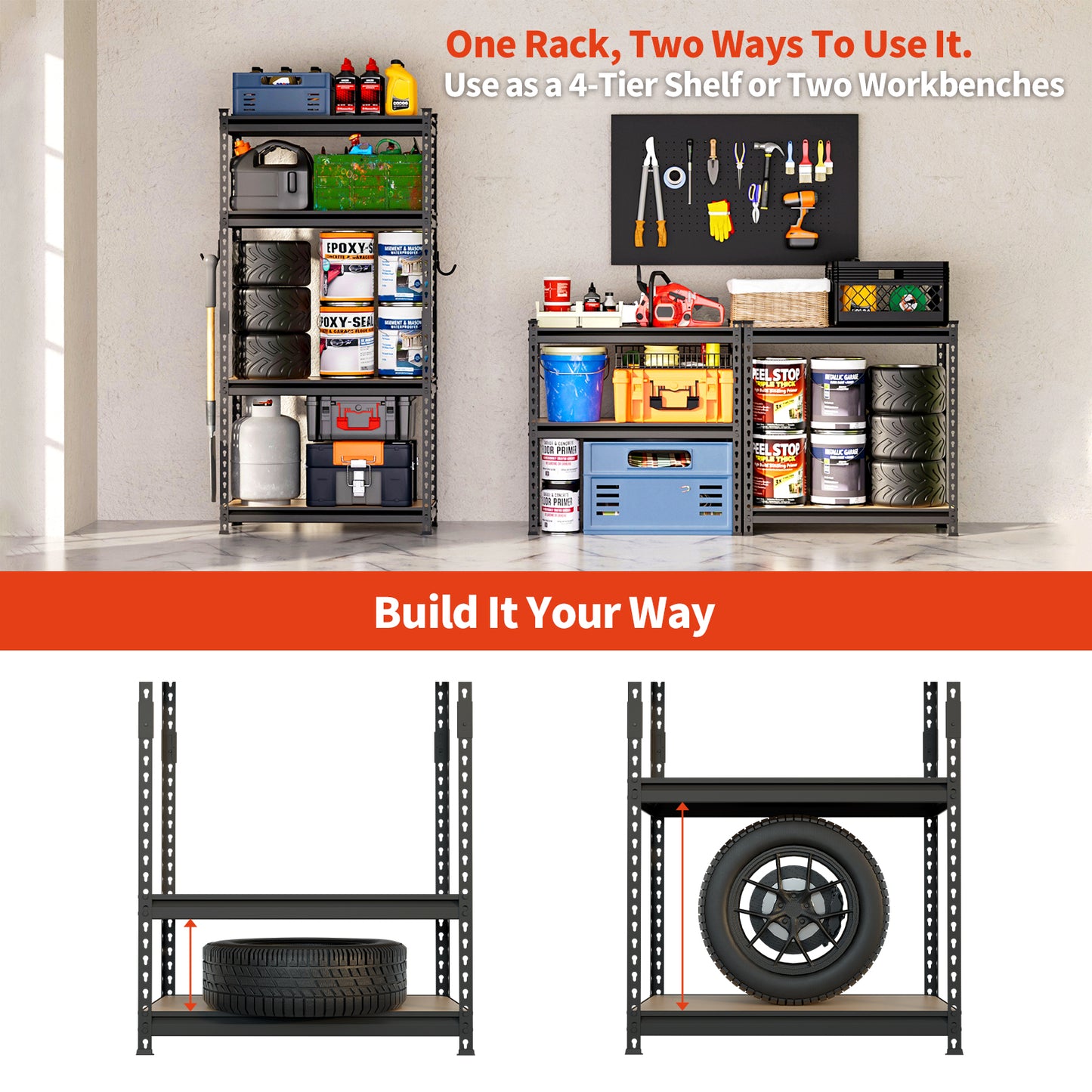 【FULLY ADJUSTABLE & 2-IN-1 VERSATILITY】: Customize your space! This 4-tier utility rack features height-adjustable shelves to fit everything from large storage bins to power tools. Assemble it as one tall 4-tier racking system or as two separate 2-tier workbenches for your workshop, garage, or basement. It's the ultimate customizable storage organizer.