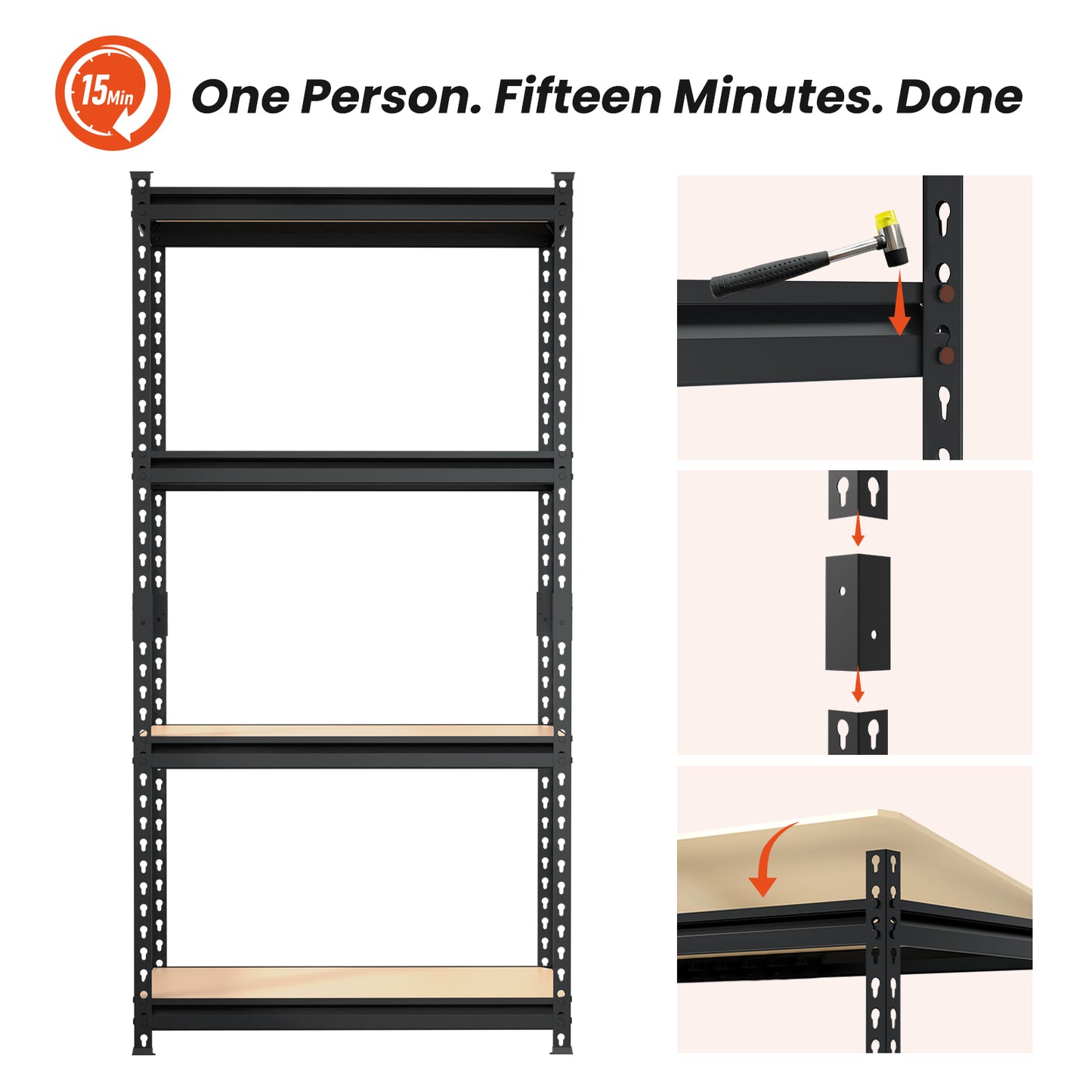 【QUICK 15-MINUTE BOLTLESS ASSEMBLY】: Reclaim your space in 15 minutes. Our innovative boltless shelving design requires no nuts, bolts, or tools for a frustration-free setup. The interlocking system allows for a sturdy and easy assembly in 15 minutes or less, so you can start organizing immediately.
