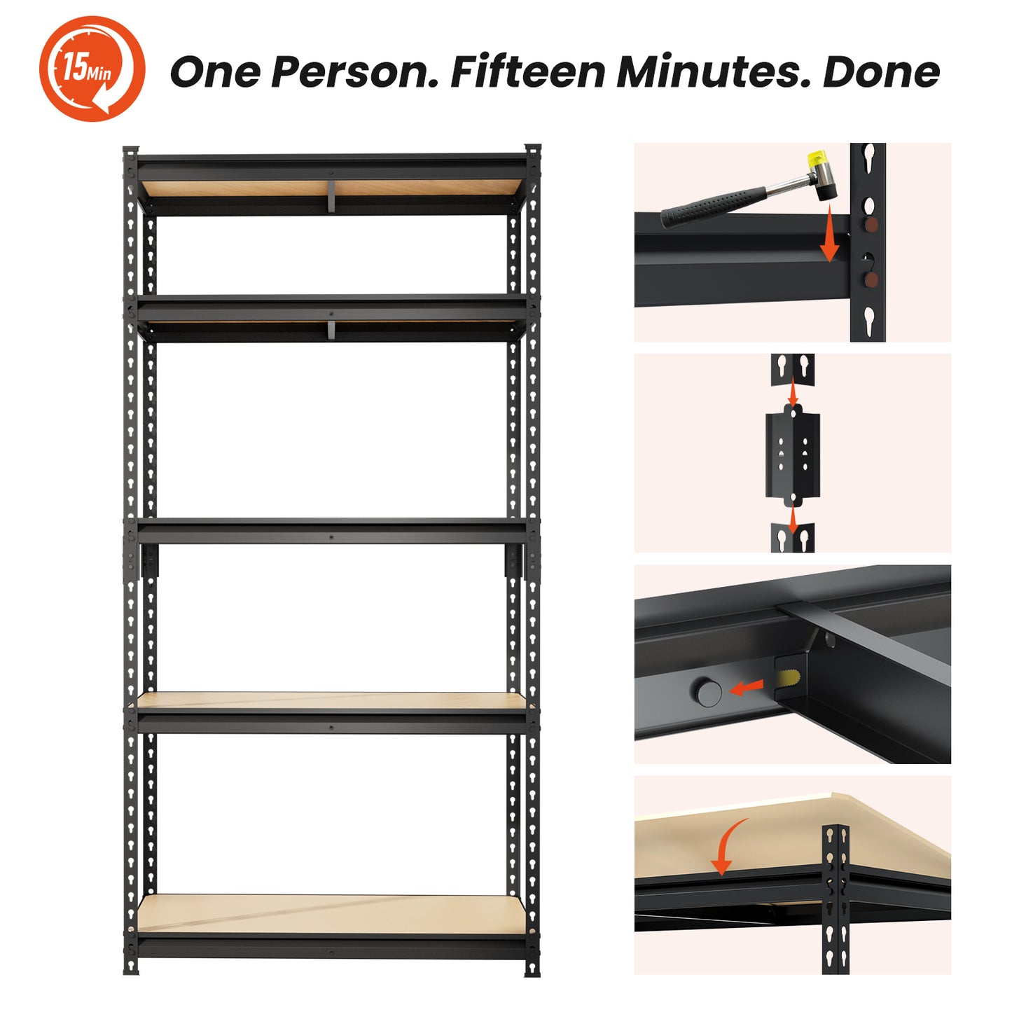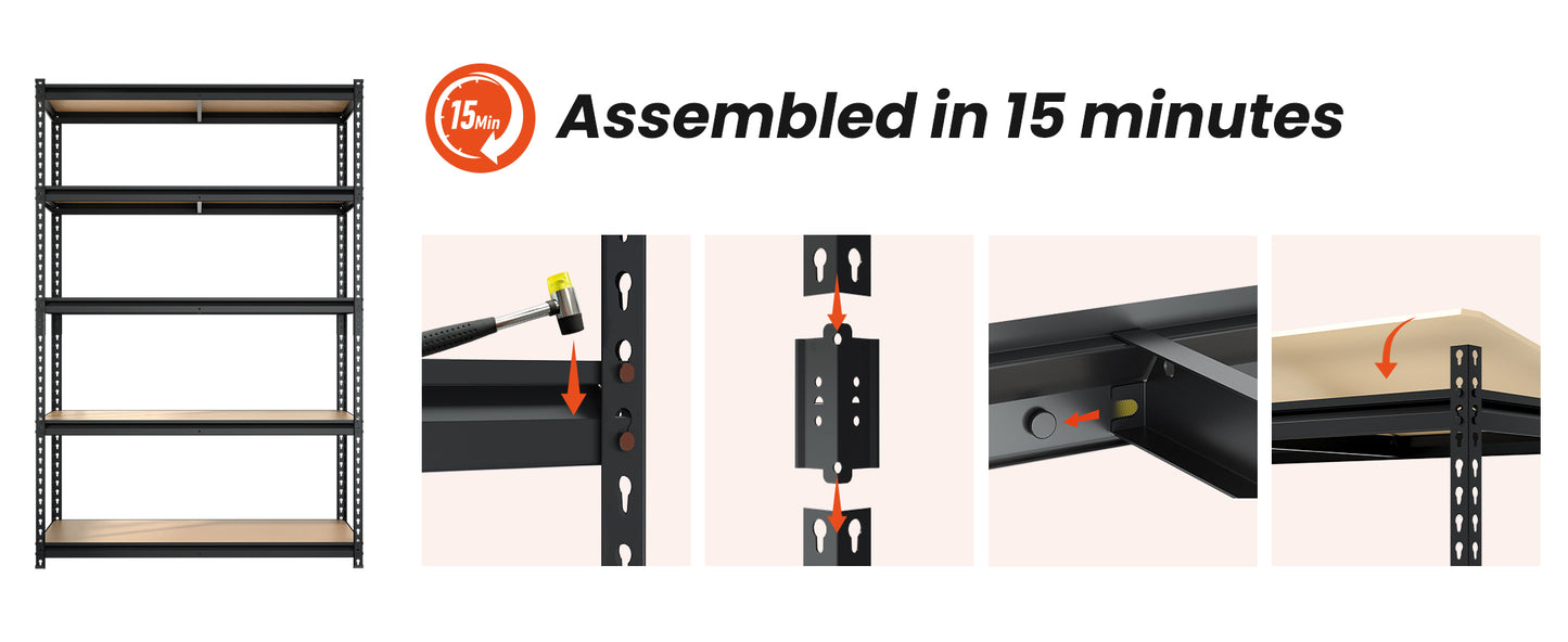 【15-MINUTE BOLTLESS ASSEMBLY】 No bolts, no screws, no headaches. Our innovative interlocking design allows for a quick, frustration-free setup. Just use a rubber mallet to snap the secure locking mechanism into place for a stable, wobble-free metal shelving unit.