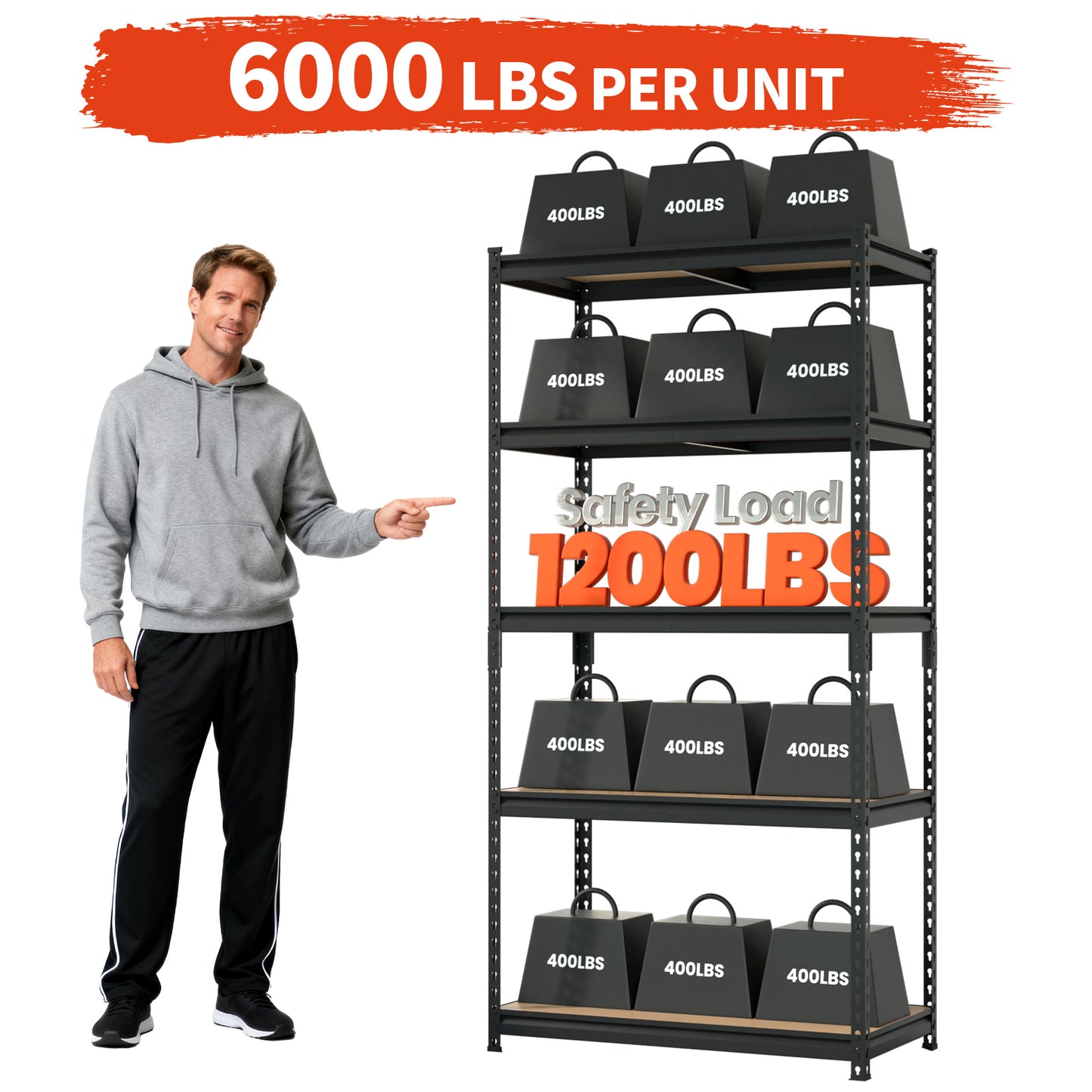 【COMMERCIAL-GRADE 6000 LBS CAPACITY】 Store everything with zero worries. This industrial shelving unit is built from a reinforced steel frame, with each of the 5 tiers supporting a massive 1200 lbs. Perfect for heavy tools, equipment, and bulk supplies. Your ultimate heavy duty storage solution.